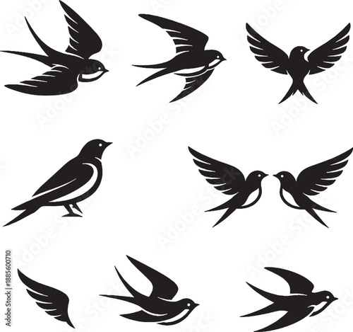 Obraz premium Swallow and Bird Silhouette Tattoo Icon Set Black and White