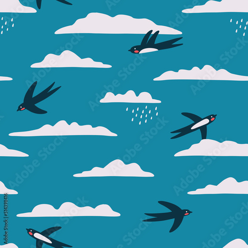 Obraz premium Swallow in the sky seamless pattern. Vector art.