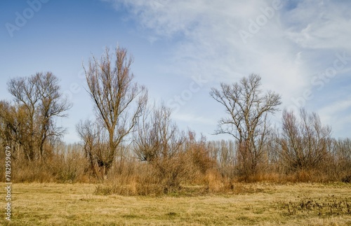 © Wirestock, Fototapeta premium Swamp covered with grass and autumn trees