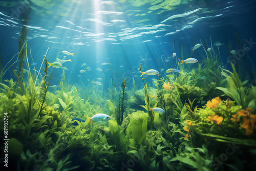 Obraz premium Swamp underwater scene with plant and fishes
