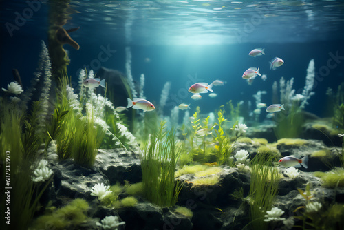 © Maizal, Fototapeta premium Swamp underwater scene with plant and fishes