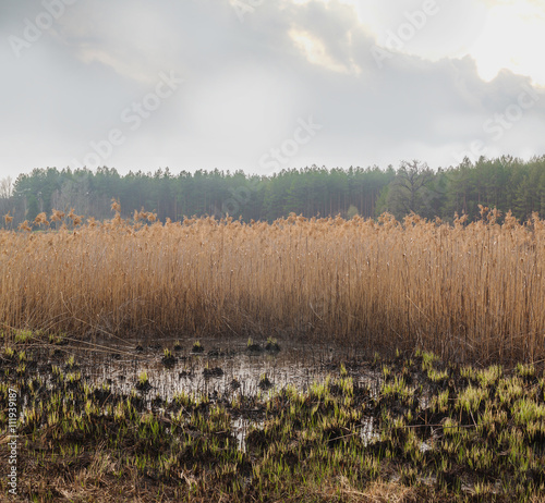 © Olesia Sarycheva, Obraz premium Swamp with dry grass spring evening