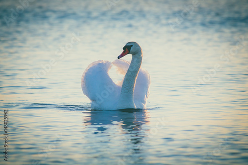Obraz premium Swan floating on the water at sunrise. Baltic Sea