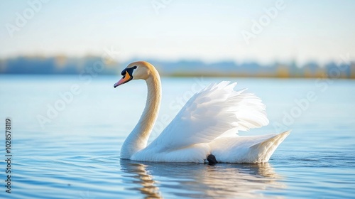 © Lion, Obraz premium Swan freely swimming in farm pond background