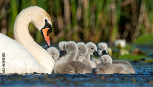 © Yakub, Obraz premium Swan mother with cygnets resting on water.