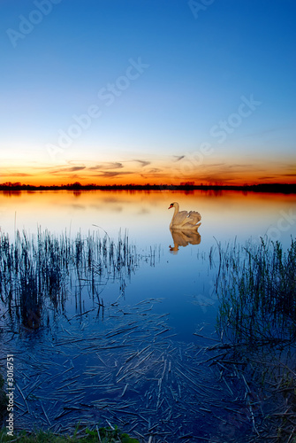 © Jaroslaw Grudzinski, Fototapeta premium swan on a lake at sunset