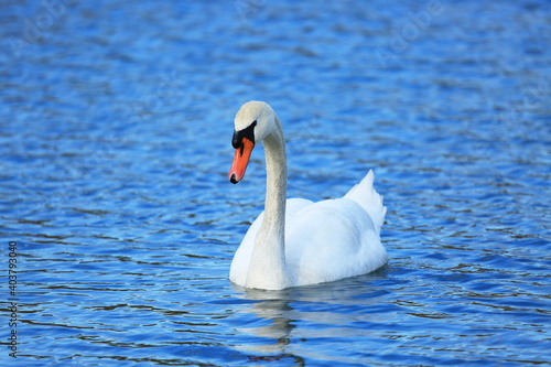 Naklejka premium Swan on the lake; beautiful elegant bird in natural habitat