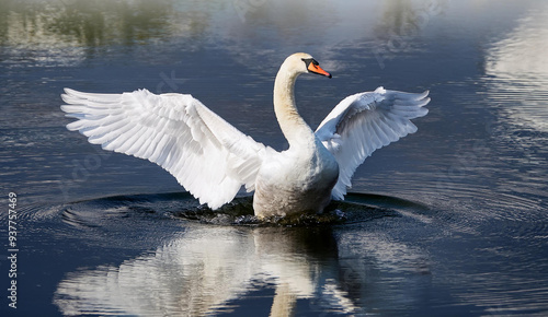 Fototapeta premium Swan on the water with its wings spread wide and its head held high