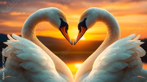 Fototapeta premium Swan Pair Forming a Heart at Sunset Symbolizing Love and Romance