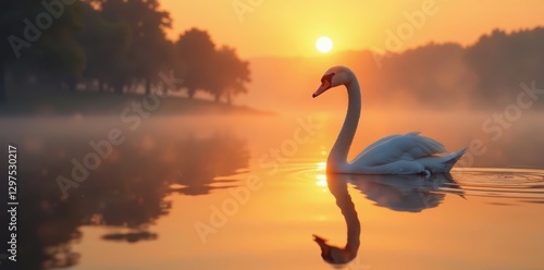 Naklejka premium Swan's silhouette and reflection, blurred sunrise, hazy horizon , evening, water, sunset