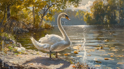 © FryArt, Fototapeta premium Swan strolling by the lakes edge