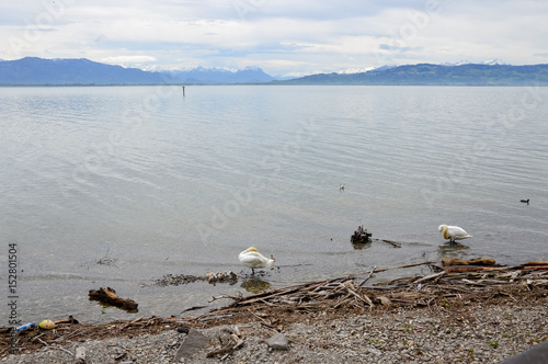 Obraz premium Swan with baby chicks, Lindau, Bodensee, in South Germany, May 2017