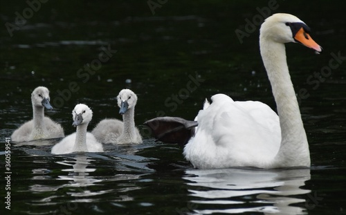 © lisica1, Fototapeta premium swan with three fluffy chicks