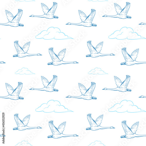 © Vasili, Fototapeta premium Swans are flying in the sky against the background of clouds. Vector illustration. Seamless vector pattern.