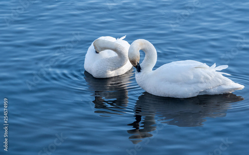 © Yan, Naklejka premium Swans are playing in open water of a lake at early spring time