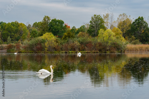 © Gokhan, Fototapeta premium Swans are swimming in the reflection of Autumn colors.