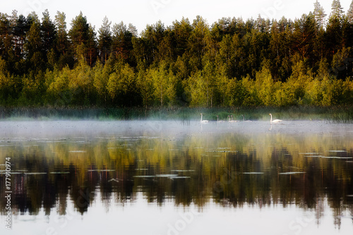© tenrec, Fototapeta premium Swans float on the lake in the morning in the fog