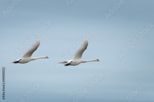 © Dead Tree World, Obraz premium swans flying (cygnus olor) against sky
