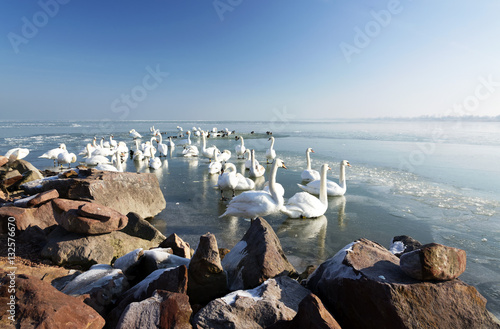 Fototapeta premium Swans on Lake Balaton in winter time, Hungary