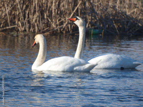 © Dmytro, Fototapeta premium Swans swim along the river in early spring