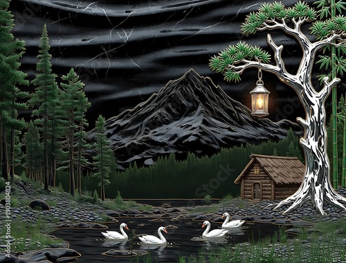 © CIZORTWIST , Naklejka premium Swans swimming in a pond in the woods