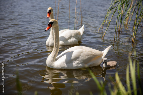 © ArtmediaworX, Obraz premium Swans with their baby swans on the lake