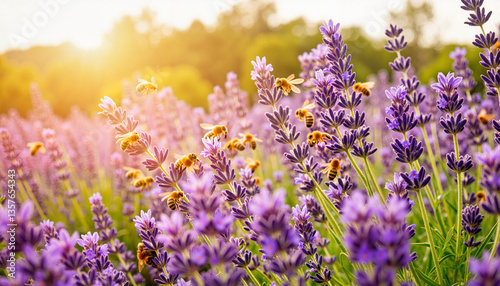 Naklejka premium Swarm of bees pollinating vibrant lavender field at sunset, nature's harmony