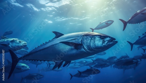 © Virgo Studio Maple, Fototapeta premium Swarm of Bluefin Tuna in the middle of the blue ocean