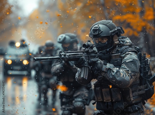 © Professional Agency, Fototapeta premium SWAT police officers in tactical gear maneuvering through a wooded area during a training exercise in autumn