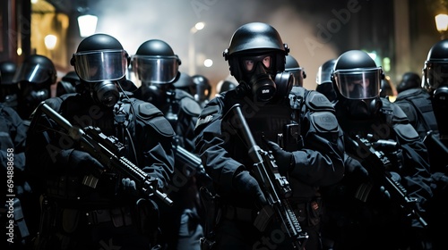 © PSCL RDL, Fototapeta premium SWAT team in full riot gear preparing to take on a night-time riot. Generative AI