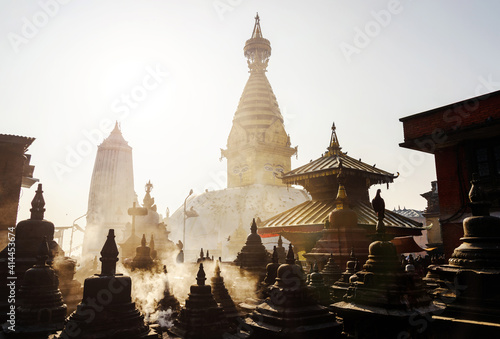 © Thomas Dutour, Fototapeta premium Swayambhunath stupa in Kathmandu, Nepal. Backlit smoke in the morning light.