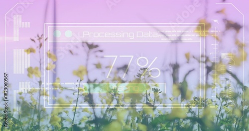 © vectorfusionart, Obraz premium Swaying yellow flower cluster catching pastel light in meadow, with HUD showing 77% processing