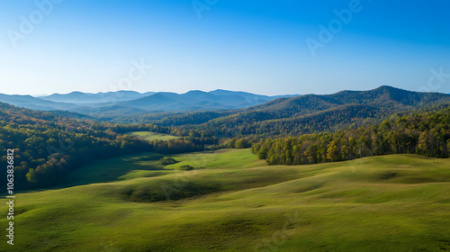 © Sarwenda, Naklejka premium Sweeping drone footage of rolling hills and distant mountains under a clear blue sky