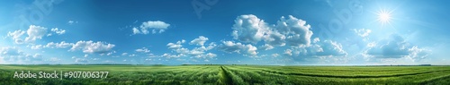 © liang, Fototapeta premium Sweeping Panorama of a Beautiful Blue Sky with Fluffy Clouds Over a Lush Green Field Landscape