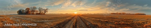 Fototapeta premium Sweeping Panoramic View of a Field with Trees and Earthy Textures at Sunset,...