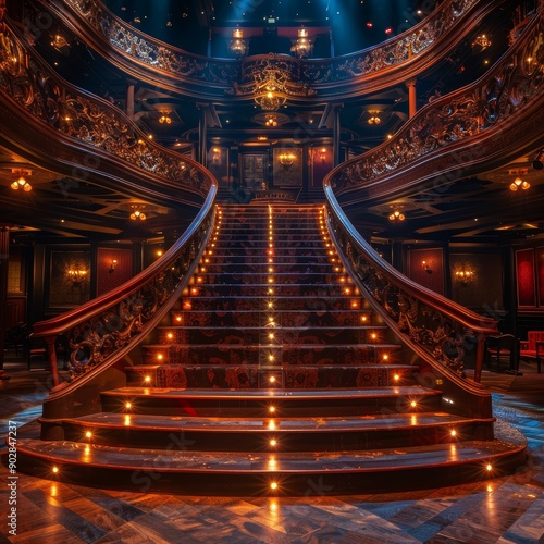 © Jardel Bassi, Obraz premium Sweeping Staircase to Expansive Shadowy Theater Stage