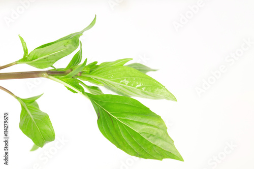 © iamaimmy, Fototapeta premium Sweet basil leaves on white background; selective focus