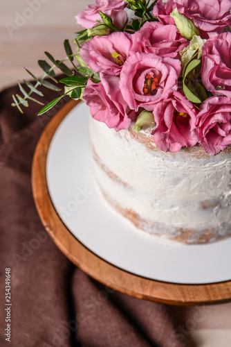 Fototapeta premium Sweet cake with floral decor on table, closeup