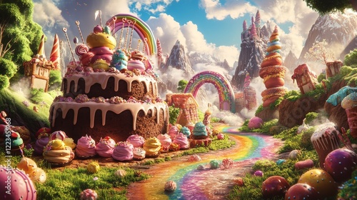 © ImageKing, Naklejka premium Sweet candy land background. Fantasy game cartoon landscape. Chocolate cake, dessert and cute rainbow illustration for fairytale backdrop. Birthday world with pink biscuit and fantastic confectionery