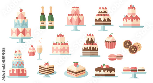 © Aoi, Naklejka premium Sweet Celebration Vector Illustration Pack A Diverse Flat Vector Assortment of Elegant Cakes, Pastries, and Drinks