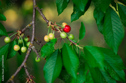 © Svetlana, Fototapeta premium Sweet cherry red berries on a tree branch close up