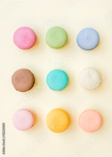© sonyakamoz, Fototapeta premium Sweet colorful French macaroon biscuits on pastel yellow background