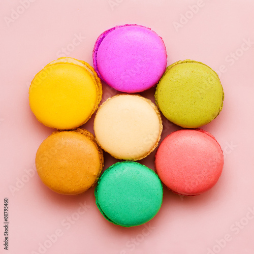 Obraz premium Sweet colorful macaroons against pink background. Top view