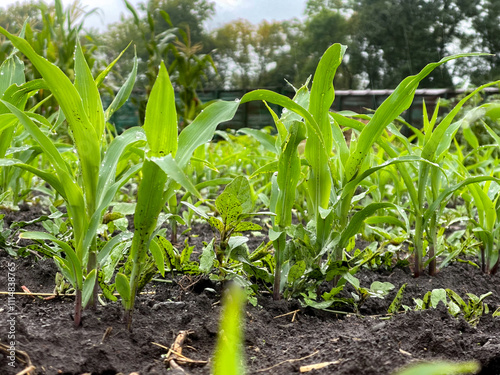 Obraz premium Sweet corn sprouts germinate on the soil in wet weather