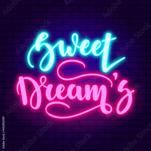© Marin4ik, Obraz premium Sweet dreams. Glowing pink neon incription on dark brick wall background
