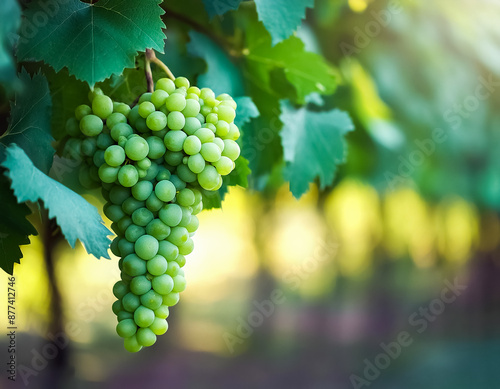 © Saddha Visual, Obraz premium Sweet fresh green grapes fruit still hanging on the tree.