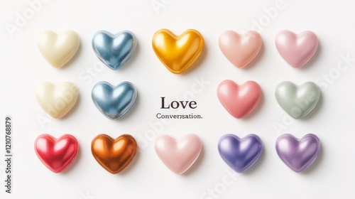 © Ruslan, Fototapeta premium Sweet heart shape candy set. Valentines day concept. Isolated on white background. Different color bundle. Conversation, Love text. Romantic colorful element collection. Flat line vector illustration.