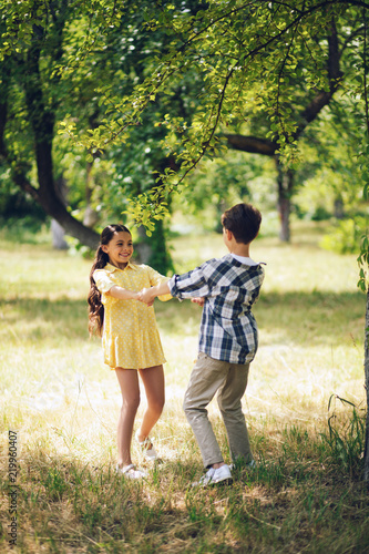 Obraz premium Sweet little couple spinning around holding hands. Beautiful young miss in summer yellow dress holding hands with young boy and spinning around in park.