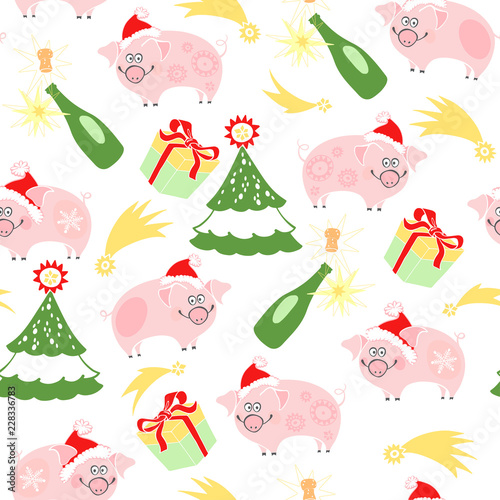 Fototapeta premium Sweet little pigs and symbols of the New Year. Vector cartoon seamless pattern. Piggy - animal symbol of new year 2019.