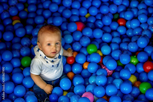 © Tomsickova, Obraz premium Sweet little toddler child, baby boy, playing in colorful plastic balls